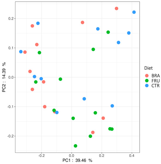Bray–Curtis principal coordinate analysis plot of sequence data from dog’s fecal microbiota. CTR—control diet low in TDF (5.7%); BRA—diet enriched with fiber from cereals (12.0% TDF); FRU—diets enriched with fiber from fruits (12.2% TDF).