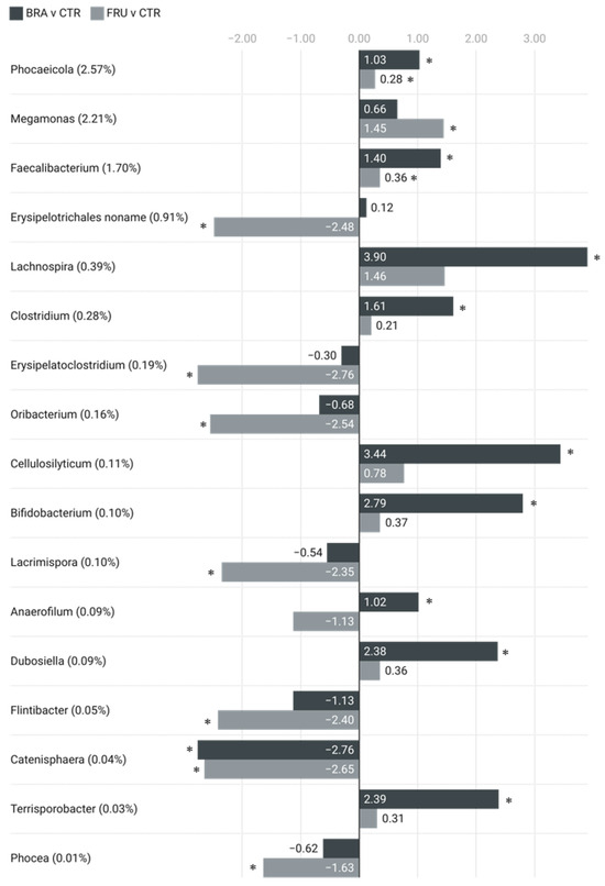 Fecal genera with significant abundance differences between fiber-supplemented diets and CTR. Data presented as logarithmic ASV counts change. Each genus’s overall relative abundance is shown in brackets. Genera are ordered by abundance. CTR—control diet low in TDF (5.7%); BRA—diet enriched with fiber from cereals (12.0% TDF); FRU—diets enriched with fiber from fruits (12.2% TDF). * p < 0.05.