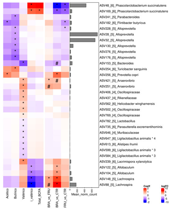 Heatmap of the correlations between SCFAs and specific ASV on the left side of the figure, and log 2 fold-change abundance differences between diets on the right side. Red on the left side means a positive correlation and blue means a negative. On the right side, red means an overabundance of the specific ASV in the former diet in comparison with the other, and blue means an underabundance. Bar graph on the right shows the average normalized counts for each specific ASV. CTR: control diet low in TDF (5.7%); BRA: diet enriched with fiber from cereals (12.0% TDF); FRU: diets enriched with fiber from fruits (12.2% TDF). * p < 0.05, # p < 0.1.