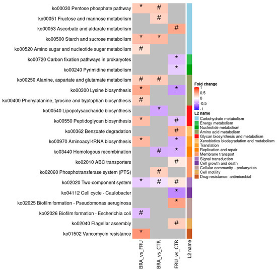 Log 2 fold-change comparison heatmap of the L3 KEGG Orthology terms abundance between treatments. Red means an overabundance of the specific KO term in the former diet of the comparison, and blue means an underabundance. CTR: control diet low in TDF (5.7%); BRA: diet enriched with fiber from cereals (12.0% TDF); FRU: diets enriched with fiber from fruits (12.2% TDF). * p < 0.05, # p < 0.1.