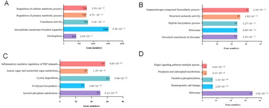 GO enrichment analysis of DEGs showed that the 6860 DEGs were significantly enriched for 785 GO terms and extremely significantly enriched for 140 GO terms, among which “nucleoplasm” and “intracellular” were the most significant. The up-regulated genes of the CA group were significantly enriched for GO terms including “nucleoplasm”, “intracellular membrane-bounded organelle”, “transferase activity”, and “regulation of primary metabolic process” (Figure 1A). The up-regulated genes of the XJ group were significantly enriched for GO terms including “structural constitution of ribosome”, “ribosome”, “peptide biosynthetic process”, and “organonitrogen compound biosynthetic process” (Figure 1B). The up-regulated genes of Yangtze finless porpoise in different environments have obvious differences in biological function.