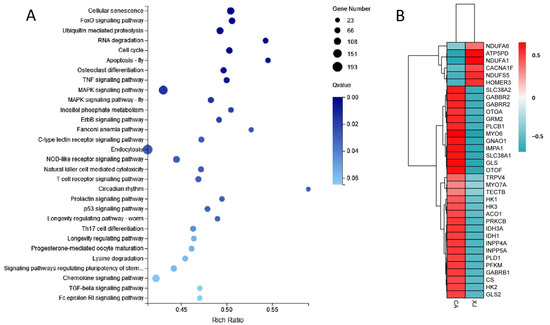 KEGG enrichment analysis of DEGs and heatmap of key genes. (A) Top 30 significantly enriched KEGG pathways. (B) The heatmap of key genes. Red indicates up-regulation, blue indicates down-regulation, and the shade of color indicates the degree of regulation.
