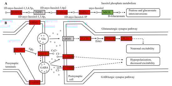 Major signaling pathways in the blood tissue of the Yangtze finless porpoise. (A) Inositol phosphate metabolism pathway; (B) glutamatergic and GABAergic synapse pathway. Red represents up-regulation in CA while green represents down-regulation in CA.