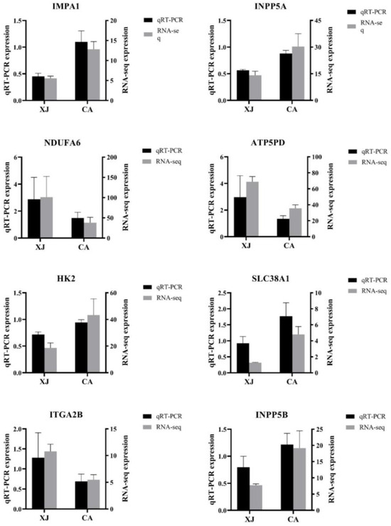 The results of qRT-PCR validation of eight randomly selected differentially expressed genes are shown in Figure 4. IMPA1, INPP5A, HK2, SLC38A1, and INPP5B were up-regulated in the CA group, while NDUFA6, ATP5PD, and ITGA2B were down-regulated in the CA group compared with the XJ group. The differential gene expression verified by qRT-PCR was generally consistent with the transcriptome sequencing results, indicating that the transcriptome sequencing results were reliable in this study.