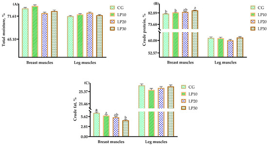 Effects of dietary lycopene on muscle nutrition in broiler chickens. Note: In breast muscles, the data in CG, LP10, LP20, and LP30 were: (A) total moisture, %, 73.75, 74.47, 72.40, 72.99, respectively, SEM = 0.30, p = 0.078; (B) crude protein, %, 82.26b, 83.27b, 83.63ab, 84.87a, respectively, SEM = 0.29, p = 0.007; (C) crude fat, %, 6.64, 5.89, 5.41, 4.56, respectively, SEM = 0.24, p = 0.012. In leg muscles, the data in CG, LP10, LP20, and LP30 were: (A) total moisture, %, 71.59, 72.09, 72.54, 71.83, respectively, SEM = 0.20, p = 0.395; (B) crude protein, %, 61.58, 61.42, 60.13, 61.80, respectively, SEM = 0.59, p = 0.779; (C) crude fat, %, 27.39, 25.90, 26.53, 27.01, respectively, SEM = 0.48, p = 0.760. a,b Means within a row with no common superscripts differ significantly (p < 0.05).