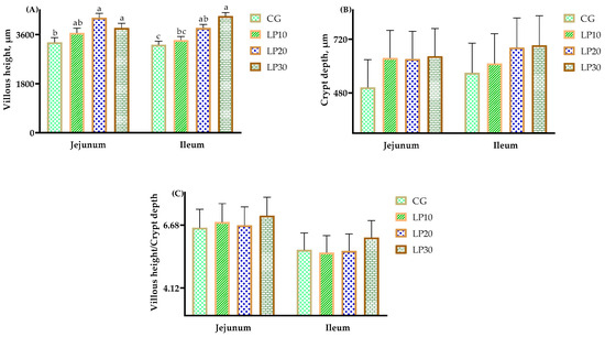 The effects of dietary lycopene on intestine histomorphology in broiler chickens. Note: In jejunum, the data in CG, LP10, LP20, and LP30 were: (A) villous height, μm, 3319b, 3666ab, 4215a, 3846a, respectively, SEM = 168.08, p = 0.040; (B) crypt depth, μm, 505, 636, 632, 644, respectively, SEM = 123.61, p = 0.204; (C) villous height/crypt depth, 6.57, 6.80, 6.67, 7.06, respectively, SEM = 0.75, p = 0.747. In ileum, the data in CG, LP10, LP20, and LP30 were: (A) villous height, μm, 3230c, 3402bc, 3848ab, 4277a, respectively, SEM = 128.04, p = 0.003; (B) crypt depth, μm, 557, 612, 683, 693, respectively, SEM = 132.34, p = 0.489; (C) villous height/crypt depth, 5.67, 5.56, 5.63, 6.17, respectively, SEM = 0.69, p = 0.118. a,b,c Means within a row with no common superscripts differ significantly (p < 0.05).