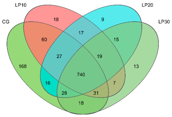 Cluster analysis was conducted on the clean reads of all samples, and a 97% similarity threshold was used for clustering sequences into operational taxonomic units (OTUs). A total of 13,223 OTUs were identified, each representing a microbial species, and the control group and the treated groups with dietary lycopene shared 740 OTUs. The four CG, LP10, LP20, and LP30 groups were exclusive to 168, 18, 9, and 13 OTUs (Figure 3). The coverage indexes in all groups were more significant than 0.99, indicating that the sequences detected in the samples were comprehensive. The differences in community diversity, Sobs, Shannon, Simpson, Ace, and Chao indices among the groups were insignificant (p = 0.691, p = 0.418, p = 0.559, p = 0.617 and p = 0.611, respectively) (Table 6).