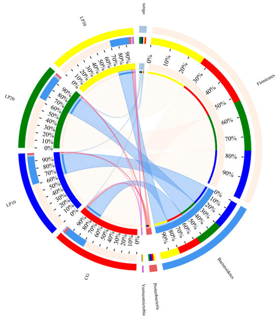 The distribution was uniform between the control and treated groups. The microorganisms in the samples mainly consisted of the phylum Firmicutes, Bacteroides, Proteobacteria, Epsilonbacteraeota, Tenericutes, Synergistetes, Verrucomicrobia, and Actinobacteria. The composition of the cecum flora of broiler chickens was dominated by the Firmicutes and Bacteroidets: the Firmicutes’ relative abundance was 69.98%, 67.33%, 64.43%, and 66.45%, respectively (p = 0.519); the Bacteroidets’ relative abundance was 24.45%, 28.09%, 25.91%, and 23.83% in the CG, LP10, LP20, and LP30, respectively (p = 0.426) (Table 7 and Figure 4). The cecum microorganisms were mainly composed of Faecalibacterium, Alistipes, Ruminococcaceae_UCG, and Unclassified-f-Lachnospiracese after sequence comparison; these four genera in the CG, LP10, LP20, and LP30 accounted for 31.64%, 43.56%, 26.71%, and 34.16% of the total flora, respectively. The Unclassified-f-Ruminococcaceae relative abundance was significantly higher (p = 0.043) in the LP20 and LP30 than in the LP10, accounting for 4.02% and 4.55% of the flora, respectively (Table 7 and Figure 5).