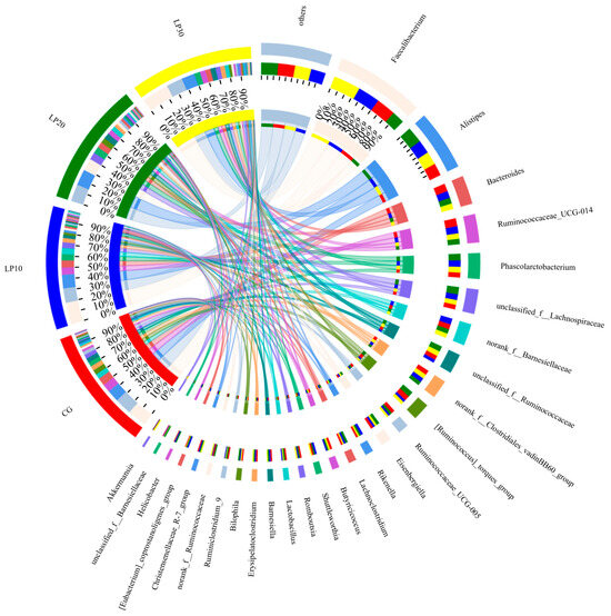 Differences of microbial species in different treatment groups at genus levels. CG: Con group; LP10: Group treated with 10 mg/kg lycopene; LP20: Group treated with 20 mg/kg lycopene; LP30: Group treated with 30 mg/kg lycopene.