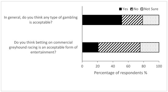 Based on the survey results, gambling on greyhound racing was considered less acceptable than gambling generally. Half of respondents indicated that gambling in general was acceptable in contrast to a fifth who considered gambling on greyhound racing acceptable. Approximately double the number of respondents considered gambling on greyhound racing unacceptable in comparison to gambling generally (55% vs. 27%). A minority (14%) responded that greyhound racing supporting legal modes of gambling is a positive attribute of the industry. Only 4% of respondents, that is 53 people, indicated they were likely to engage with greyhound racing in the next 6 months. Our results indicate that gambling concerns alone could not explain respondents’ negative view of commercial greyhound racing. Studies examining attitudes to betting on horse racing found that both concerns about gambling and about animal welfare can influence opinions and stated behaviors related to betting on animal races [36].
