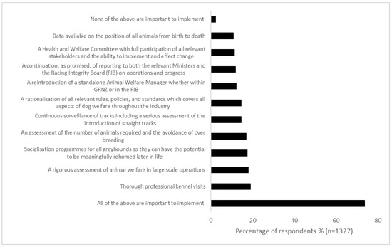 Respondents were asked which of the recommendations from a list sourced from the Robertson [16] report were important to implement (Figure 4). Most respondents reported that all should be implemented (970/1327, 73.1%) with thorough professional kennel visits (to check for compliance with welfare standards; 252/1327, 19.0%), rigorous assessment of animal welfare in large scale operations (239/1327, 18.0%), and introduction of socialization programs for all greyhounds (231/1327, 17.4%) the most important recommendations for improving greyhound welfare.