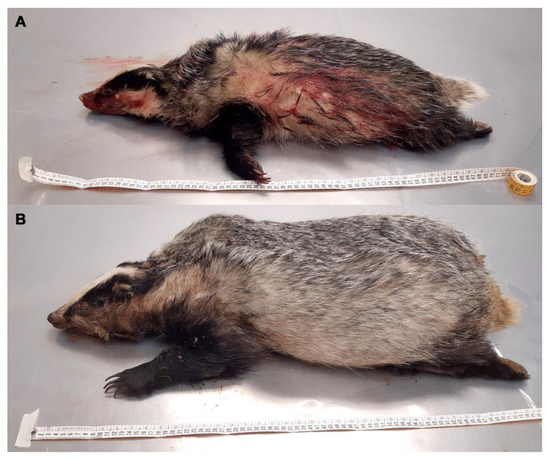A wide variety of methods were used to age badgers. These included techniques based on the fusion of tibial epiphyses, teeth sectioning, teeth wear, eye lens mass, and skull structure, but accurate aging of adult badgers remains problematic [25]. So, in this study, the classification into young and adult animals was carried out by measuring the distance from the tip of the nose to the base of the tail. Usually, in adult badgers, this distance is 61–73 cm (cm) [26]. Badgers with a length of less than 61 cm were considered young (Figure 1A,B).