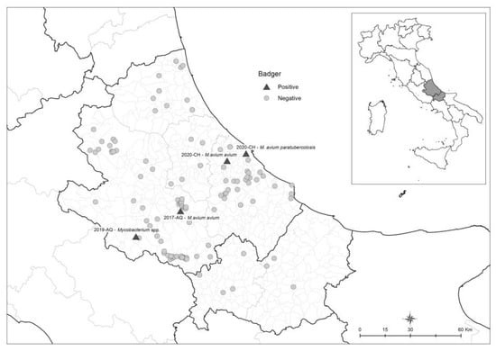 Between 2013 and 2021, the carcasses of 124 badgers, including 113 adults and 11 juveniles (63 females and 61 males), mainly involved in road accidents in Abruzzo and Molise regions, were examined at IZS-Teramo. The carcasses were found in the following provinces: 65 in L’Aquila, 32 in Chieti, 15 in Teramo, 4 in Isernia, 5 in Pescara, and 3 in Campobasso.