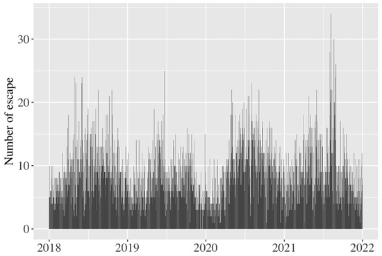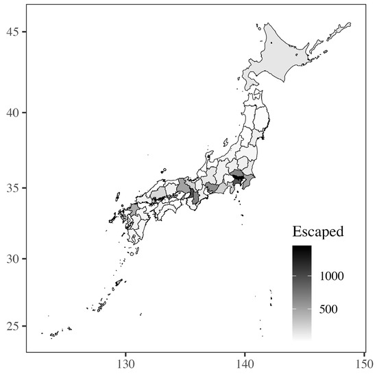 A total of 12,126 escapes were detected over the four years from 2018 to 2021 (Table S2). Escapes occurred in all prefectures in Japan (Figure 1). The number of escapes was high in prefectures with large cities and populations, and the prefecture where the most frequent escapes occurred was Tokyo. The escape rate was high in summer and low in winter (Figure 2), with no instances of escape on single days.