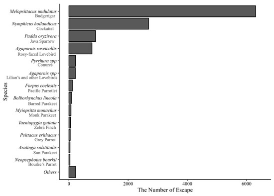 More than 60 escape species were identified during the study period (Table S2). Among the escaped species, 91% were Psittaciformes.