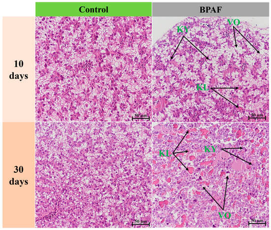 Effects of BPAF treatment on the histological structure of the liver. VO: vacuolization; KY: karyopyknosis; KL: karyolysis. Scale bar: 50 μm.