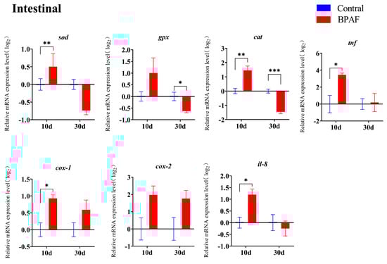 Exposure to BPAF impacts the transcriptional levels of antioxidant and inflammatory-related genes. The transcription levels of cox-1 and il-8 in the liver were noticeably up-regulated after 10 days of exposure (Figure 4), as well as cat, cox-1, il-8 and tnf in the intestine (Figure 5). After a period of 30 days of exposure to BPAF, the mRNA levels of pparα, pparβ, sod, and cat in the liver (Figure 4), as well as those of pparα, pparβ, sod, and cox-1 in the intestine, were significantly reduced. Notably, genes (pparβ, gpx, sod, cat, il-8) in both the liver and intestine revealed a dynamic change of, first, up-regulation and, then, down-regulation on the 10th and 30th day of BPAF exposure. Compared with the control group, there were significant up-regulations and down-regulations of pparβ and cat (Figure 4 and Figure 5).