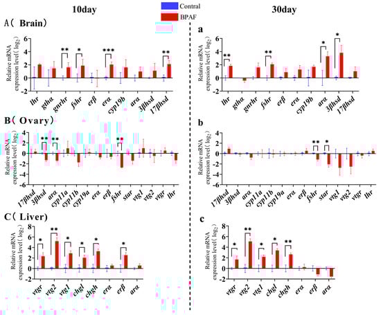 Compared with the control group, the mRNA expression levels of gnrhr, fshr, erα, and 17βhsd in the brain of marine medaka were significantly increased after 10 days of BPAF exposure, and the transcription levels of lhr, gthα, cyp19b, arα, and 3βhsd showed a tendency to rise (Figure 6A). Meanwhile, in the ovaries, there was significant down-regulation in the transcript levels of 3βhsd, arα, and fshr (Figure 6B). Significant up-regulation was observed in the vtgr, vtg2, vtg1, chgl, chgh, and erβ transcript levels in the liver (Figure 6C). After 30 days of BPAF exposure, the transcription levels of lhr, fshr, arα, and 3βhsd in the brain of marine medaka were significantly up-regulated compared with those in the control group (Figure 6a). The transcript levels of fshr and star were significantly down-regulated in the ovaries (Figure 6b). A substantial rise in the transcript levels of vtg2, vtg1, chgl, and chgh was observed within the liver (Figure 6c). The majority of the genes measured in the brain and liver exhibited continuous up-regulation from the changes seen on exposure day 10 to day 30 (Figure 6A,a,C,c). Among the genes measured in the ovaries, the transcript level of fshr showed a sustained down-regulation, and the transcript levels of 3βhsd and arα switched from being significantly down-regulated to showing no difference, whereas the star transcript levels were down-regulated in the BPAF-exposed groups (Figure 6B,b).