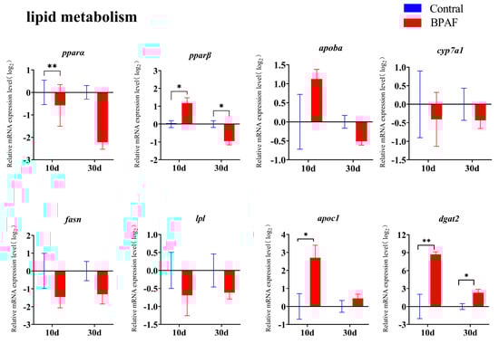 Fish liver is the main organ for lipid synthesis and metabolism. Diacylglycerol acyltransferase 2 (DGAT2), peroxisome proliferator-activated receptors (PPARS), and fatty acid synthase (FASN) are the key elements of triglyceride synthesis in animals [40]. Apolipoprotein Ba (APOBA), fatty acid binding protein (FABP), and apolipoprotein C-I (APOC1) are involved in lipid transport, while peroxisome proliferator-activated receptor α (PPARA) and lipoprotein lipase (LPL) are involved in lipid oxidation [41]. Exposure to BPA analogs can affect the transport and synthesis of fatty acids in zebrafish, resulting in lipid accumulation [42]. In the present study, the mRNA expression of dgat2, apoc1, and pparβ significantly increased after 10 days of BPAF exposure (Figure 7), indicating that BPAF enhances lipid synthesis in the medaka liver, resulting in hepatic lipid accumulation. These findings may be associated with the observed vacuolization in the liver (Figure 2). However, after a 30-day exposure to BPAF, the activity of enzymes that promote lipid synthesis (apoc1 and apoba) decreased, resulting in a slowdown in lipid accumulation (Figure 7). It can be surmised that liver injury in medaka may be associated with disrupted lipid metabolism caused by the impact of BPAF on gene expression involved in fatty acid synthesis and oxidation.