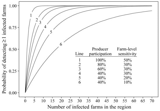 The objective of Phase 2 was to estimate the probability of detecting ≥ 1 positive farms in the region as a function of farm-level sensitivity, percent of farms participating in the surveillance program, and regional farm-level prevalence. The results were expressed in terms of the probability of detection by regional herd prevalence (from Phase 1 simulation results) rather than time-to-detection because of the diversity of spread rates simulated in the ADSM software. A difficulty when applying targeted sampling to surveillance is the absence of agreed-upon methods for calculating sample size and associated farm-level sensitivities. Using a modeling approach, Nielsen et al. [32,33] reported that targeted sampling of 5 sick or dead pigs in a population of 1000 pigs would detect CSFV 4 to 37 days and ASFV 13 days post-introduction with 95% probability. In the present study, a sample size of 10 pigs was considered a practical number for on-farm collection. The present study was not pathogen-specific and, in the absence of citable estimates, a conservative range of farm-level detection sensitivities (10%, 20%, 30%, 40%, and 50%) was used in the Phase 2 detection analysis. Similarly, data to inform the level of farm participation in this voluntary regional surveillance program were lacking. Consequently, adopting an approach that would inform administrators if such a program were to be initiated, a range of participation levels (20%, 40%, 60%, 80%, 100%) were evaluated for their effect on detection by prevalence.