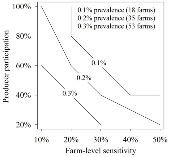 As shown for 3 prevalence levels, various combinations of producer participation and farm-level sensitivity produced ≥ 95% probability of detecting ≥ 1 positive herds in the region. Farm-level sensitivity is the probability of a positive test on samples from an infected farm.