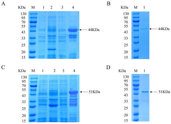 The recombinant Cap protein with His and GST tags was constructed for immunization and analysis, respectively, to exclude the effect of tagged antibody production in immunized mice. The expression of the His-Cap protein was characterized via SDS-PAGE, which showed a distinct band with a molecular weight of approximately 44 kDa (Figure 1A). After Ni-chelating affinity chromatography, the purified protein was detected as a single band (Figure 1B). The prepared GST-Cap protein with an approximate molecular mass of 51 kDa was identified and purified (Figure 1C,D). The approximate size of the expressed protein was the same as expected.