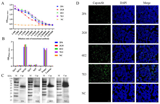 Characterization of mAbs. (A) Titers of four mAbs, 2F6, 2G8, 6E2, and 7E3, were 1:2.56 × 104, 1:2.56 × 104, 1:5.12 × 104, and 1:1.024 × 105, respectively. (B) Isotyping MAbs were characterized following the kit’s instructions. The results were read at 450 nm. (C) Western blot analysis of four mAbs. The four mAbs specifically reacted with recombinant GST-Cap protein at 51 kDa. (D) IFA analyzed mAbs affinity for recombinant Cap protein in 293T cells. The green color represents anti-Cap protein mAbs; the blue color represents nuclei. The uninoculated cells were used as negative control (NC).