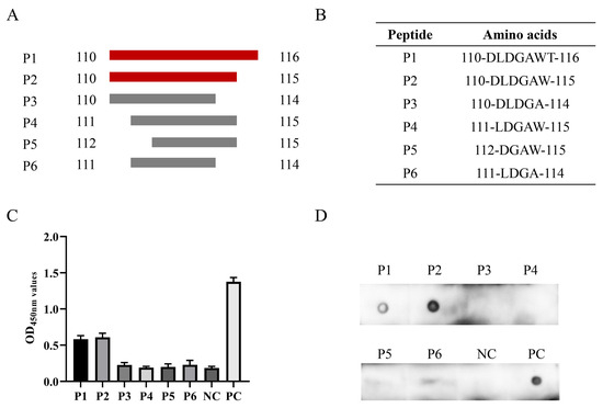 To determine the minimal B cell epitope, six short peptides were designed and synthesized for subsequent experiments (Figure 5A,B). The ELISA and dot blot results indicated that mAb 7E3 generated a specific reaction with P1 and P2 and did not react with P3–P6 (Figure 5C,D). All data obtained above indicated that 110DLDGAW115 is the minimal B cell epitope of the PCV3 Cap protein recognized by mAb 7E3.