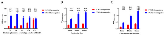 Optimization of developed EB-ELISA reaction conditions. (A) Different dilution of the tested porcine sera. OD450 value of positive or negative serum samples at different dilutions was measured using EB-ELISA. (B) Determine the incubation time after addition of the antibody to be examined. (C) Optimal time for color development with the addition of TMB substrate.