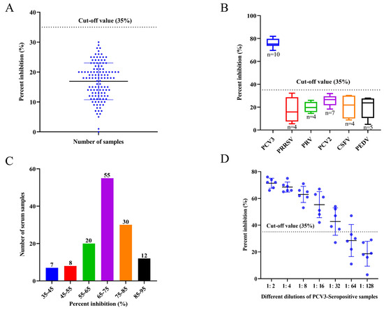 Specificity and sensitivity of the EB-ELISA for detecting anti-PCV3 antibodies. (A) In total, 120 PCV3-Seronegative serum samples were tested using EB-ELISA for calculating the cut-off value. (B) The blocking rate of porcine virus sera was measured by the developed EB-ELISA to determine the specificity of this assay. PCV3 serum samples tested had PI values above the cut-off value, while the rest of the samples had PI values below the cut-off value. (C) Distribution of PI values of clinically identified PCV3-positive sera by EB-ELISA. (D) Maximum detection limit of PCV3-positive serum by the developed EB-ELISA.