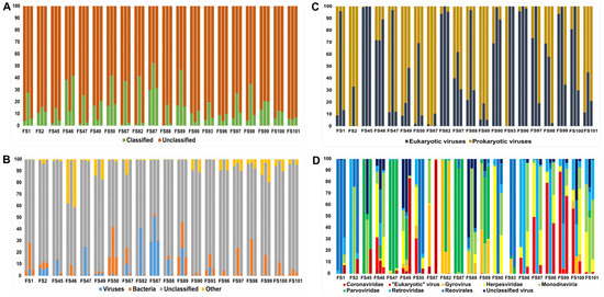 Results of the NGS experiments on the enteric samples, expressed as % values, as decoded using Kraken (left column), Kaiju (central column) and Centrifuge (right column). (A) Ratio of classified vs. unclassified reads; (B) composition of the reads based on viral, bacterial, or ‘other’ origin; unclassified reads are also displayed; (C) ratio of eukaryotic vs. prokaryotic reads; (D) composition of viral reads based on taxonomical attribution.