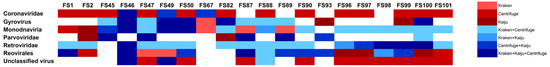 In this study, we analyzed archived samples whose majority (85%) was stored >10 years before being processed. No samples from the most recent years were available. By using metagenomic tools, viral reads were found in various proportions in the pooled samples, ranging from <0.01% to 59%. This is consistent with findings of other reports showing that low percentages of viral reads in metagenomic assemblages are a typical finding [19,20,21]. Despite these shortcomings, both RNA and DNA viruses were detected with our protocols. However, it is of note that virus-specific PCR results and metagenomics data did not fully match. For example, astrovirus-specific sequence reads were not generated at all, although some samples tested positive using standard PCR assays. Similarly, detection rates of other RNA viruses were lower with metagenomics than expected from routine laboratory results obtained with specific PCR assays. It is very likely that these discrepancies were at least partly related to either low virus titers of the samples or depletion of viral RNA under storage conditions.