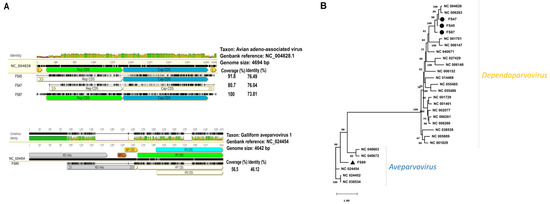 (A) Comparative genomic illustration of the identified dependoparvovirus sequences with their reference sequences. (B) Maximum likelihood phylogenetic tree of representative capsid nt sequences of Dependoparvovirus and Aveparvovirus genus (PhyML 3.0, TNR93 + R model, aLRTSH-like branch support). Branch support values lower than 80 were hidden. Sequences identified in this study are highlighted with dots.