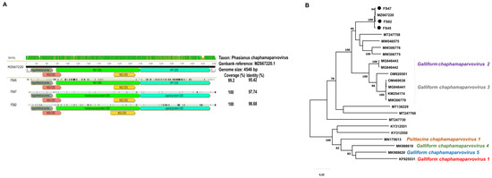 The genomes of three chaphamaparvoviruses were almost completely determined. These genomes were assembled from a large portion of raw reads (FS45, 8.1%; FS47, 81.6%; FS82, 60.5%), resulting in considerable sequence depths for the three genomes (ranging from 4750× to 71,384×). These results showed that pheasant chaphamaparvoviruses constituted a major component of the metagenomic assemblage in the tested sample pools. The genome lengths varied as follows: FS45, 4510 nt; FS47, 4454 nt; FS82, 4458 nt. The NS1 and NS3 genes showed no variation in length among genomes (NS1, 2022 nt; NS3, 444 nt), whereas the VP1 (1653 nt to 1689 nt), NS2 (519 nt to 597 nt) and hypothetical protein coding ORF (504 to 525 nt) showed sequence length differences among samples. The three Hungarian strains shared 94.1 to 96.4% genome sequence nt identity and 95.4 to 97.7% to the reference pheasant chaphamaparvovirus strain from France (Figure 4). The second and third most closely related chaphamaparvoviruses, strain bls219par05 from black swan (Cygnus atratus) and strain CTCPaV1/CT08.18-AU-2018 from chestnut teal (Anas castanea), shared, respectively, up to 68.8% and 69.6% genome-wide nt identity to pheasant-origin chaphamaparvoviruses.