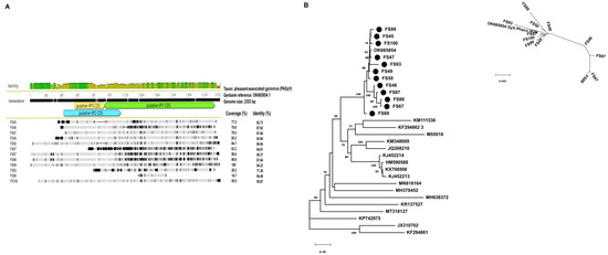 Concerning genomoviruses, the sequence reads from FS82 and FS49 assembled into a 2040 nt and a 2232 nt contig by reference mapping, respectively (Figure 6). Concerning FS82, the genomovirus-specific contig was assembled from 1004 reads (out of 17,507,704 total reads, at a sequencing depth of 52×), whereas the FS49 was assembled from 128 reads (out of 1,470,963 total reads at a depth of 7×).