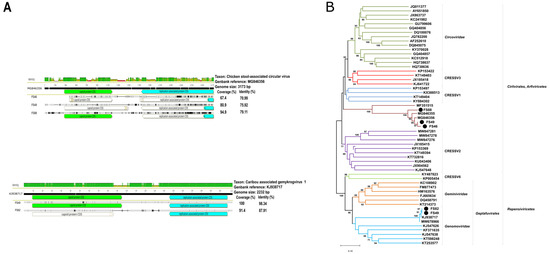 (A) Comparative genomic illustration of the selected CRESS DNA sequences with their reference sequences. (B) Neighbor-joining phylogenetic tree of representative partial Rep aa sequences of CRESS DNA viruses (MEGA-X software, bootstrap tests of 1000 replicates, p-distance model). Branch support values lower than 60 were hidden. Sequences identified in this study are highlighted with dots.
