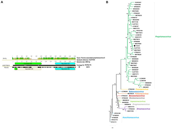 (A). Comparative genomic illustration of the identified proprismacovirus sequence with the reference sequence. (B). Maximum likelihood phylogenetic tree of representative rep aa sequences of Smacoviridae (PhyML 3.0, Q.fam+G+I+F model, aLRTSH-like branch support). Branch support values lower than 70 were hidden. Sequences identified in this study are highlighted with dots.