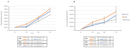 The pig intestinal cells receiving YSM (150 ppm) demonstrated significantly greater cell densities (2.05 × 105 ± 1.83 × 104 CFU/mL) compared to the control (1.23 × 105 ± 1.87 × 104 CFU/mL, p ≤ 0.05) and butyrate (150 ppm)-treated cells, which had lower cell densities (1.11 × 105 ± 0.42 × 104 CFU/mL, p ≤ 0.01) at 24 h (Figure 1A). A similar trend was observed at 48 h for the butyrate-treated cells, which had lower cell densities (3.1 × 105 ± 2.15 × 104 CFU/mL, p ≤ 0.05) compared to the cells receiving YSM (4.2 × 105 ± 5.01 × 104 CFU/mL). The 72 h time point demonstrated significantly lower cell concentrations in the butyrate-treated cells (5.13 × 105 ± 2.42 × 104 CFU/mL) compared to the control (6.32 × 105 ± 1.12 × 104 CFU/mL, p ≤ 0.05) and the cells receiving YSM (7.08 × 105 ± 3.63 × 104 CFU/mL, p ≤ 0.01).
