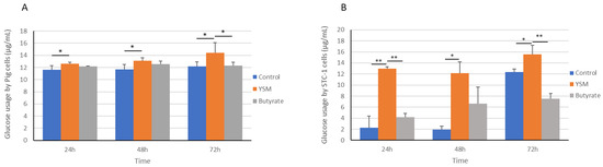 Glucose utilised from media by pig (A) and STC-1 intestinal cells (B) in response to supplementing with butyrate or YSM, or the non-supplemented control, for 24, 48, and 72 h. Statistical analysis was performed using one-way ANOVA and Tukey’s post hoc test (n = 3), p ≤ 0.05 *, p ≤ 0.01 **.