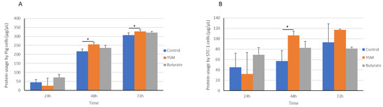 Protein usage from media by pig (A) or STC-1 mouse intestinal cells (B) in response to supplementing with butyrate or YSM, or the non-supplemented control, for 24, 48, and 72 h. Statistical analysis was performed using one-way ANOVA and Tukey’s post hoc test (n = 3), p ≤ 0.05 *.