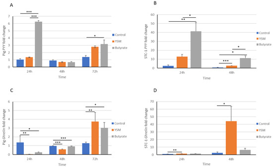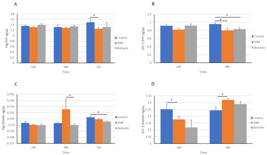 The consumption rate of food is strongly regulated by hormones that supress appetite, including PYY, and those that drive appetite, such as ghrelin; for this reason, STC-1 cells and pig intestinal cells were assessed here for their expression of these appetite-regulatory hormones. Greater gene expression levels of PYY (Figure 5A,B) were observed in response to butyrate over the control. Several publications have highlighted that in vitro models receiving butyrate had increased PYY expression [42,43] and PYY hormone secretion [44]. The pig intestinal cells receiving YSM demonstrated a significantly lower abundance of PYY compared to the control at 72 h (Figure 4A). Secreted PYY hormone levels were similarly high in the butyrate-treated cells at 24 h, but a significantly lower PYY abundance was found in the butyrate- and YSM-treated cells at 48 h compared to the control. This may be attributed to time differences in protein translation from gene expression and to the time it takes for proteins to be absorbed into the cells.