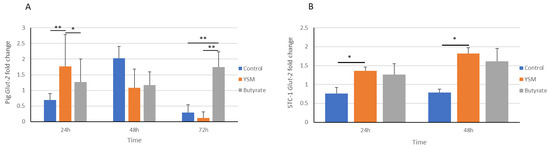 The Glut-2 transporter is responsible for regulating glucose transportation and uptake in cells. The expression of the gene for this transporter was greater in the pig intestinal cells that received YSM at 24 h (Figure 6A) when compared to the control and butyrate-treated cells. This coincided with the higher Glut-2 expression observed in STC-1 cells (Figure 6B) at 24 h, although this was also observed at the 48 h time point, unlike the pig intestinal cell expression of Glut-2, which was highest at 24 h. The pig intestinal cells had significantly greater levels of Glut-2 expression in their butyrate-treated cells, which may have resulted from a delayed response for sustaining growth requirements compared to the cells receiving YSM, which peaked at 24 h, and the control that peaked at 48 h. Cell densities observed in the YSM-treated cells were also elevated over both the control and butyrate-treated cell groups. The elevated expression of Glut-2 may have contributed to the greater utilisation of glucose from the media of cells receiving YSM (Figure 2A,B).