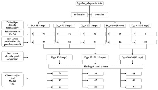 About 4 million pediveliger larvae were produced and the corresponding aliquot was taken for each density treatment (Dx). Several larvae stocking densities were enforced in five treatments with replicates (rep), i.e., low density: DL = 35 larvae/cm2 (4 rep), medium density: DM1 = 70 larvae/cm2 (5 rep) and DM2 = 100 larvae/cm2 (8 rep); and high density: DH1 = 140 larvae/cm2 (5 rep) and DH2 = 210 larvae/cm2 (5 rep).