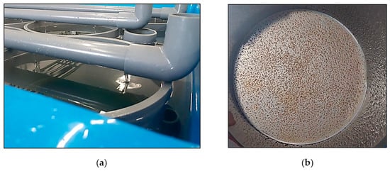(a) Specific replicated structure implemented to monitor metamorphosis and settlement of mussel post-larvae; (b) detail of the downwelling system designed for rearing and tracking the larvae–post-larvae transition.
