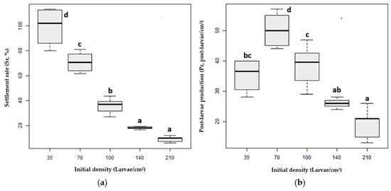 (a) Settlement rate (Sr, %); (b) post-larvae production (Pr, post-larvae/cm2) at different larvae stocking densities: DL = 35 larvae/cm2; DM1 = 70 larvae/cm2; DM2 = 100 larvae/cm2; DH1 = 140 larvae/cm2; and DH2 = 210 larvae/cm2. A significant difference exists between treatments with different superscripts (a–d).