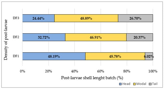 Three post-larvae shell length batches were obtained from each post-larvae density distribution (DF1, DF2, DF3) (Figure 5). The lower the post-larvae density, the higher the share of the head batch, e.g., DF1, head batch = 48.19%. By contrast, the higher the post-larvae density, the higher the share of the tail batch, e.g., DF3, tail batch = 26.70%.