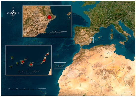 A total of 99 locations from different sources have been investigated, and the exact coordinates of each one have been obtained and included in the atlas database. The majority of these belong to the province of Las Palmas (85 locations), mainly on the islands of Gran Canaria, Fuerteventura, and Lanzarote, followed by the province of Santa Cruz de Tenerife (13 locations), mainly Tenerife Island, and the province of Alicante (1 location). Positive samples were found in 19% of the surveyed locations, with the majority being located in the province of Las Palmas (Figure 2).