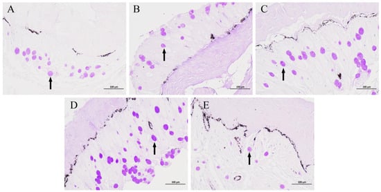 AB-PAS staining of the P. ussuriensis skin tissues. Groups C, N3, N6, N12, and O12 correspond to panels (A–E), respectively. The mucous cells are indicated by black arrows. Scale bar: 100 μm.