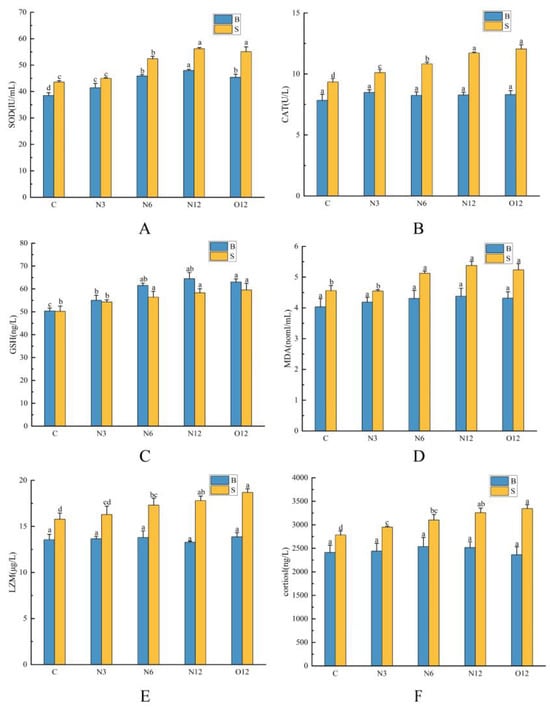 Effects of hypoxia on SOD (A), CAT (B), GSH (C), MDA (D), LZM (E), and cortisol (F) levels in the brain (B) and skin (S) tissues of P. ussuriensis. The different lowercase letters indicate significant differences at p < 0.05.