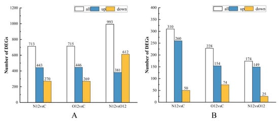 An analysis of the differential gene results in the different skin groups revealed that in the comparison of group N12 to group C, there were a total of 713 differential genes, with 443 being upregulated and 270 being downregulated. When comparing group O12 to group C, there were 715 differential genes, with 446 being upregulated and 269 being downregulated. In the comparison of group N12 to group O12, a total of 993 differential genes were found, with 381 being upregulated and 612 being downregulated (Figure 3A).